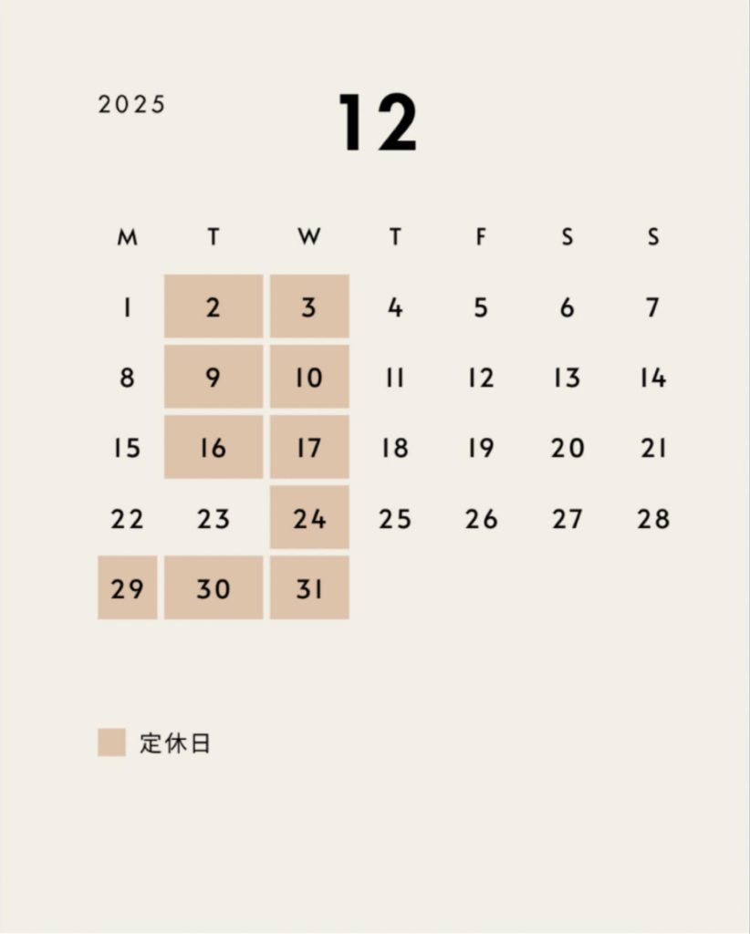 毎週水曜日・第1/第2/第3火曜日の定休日に加え、