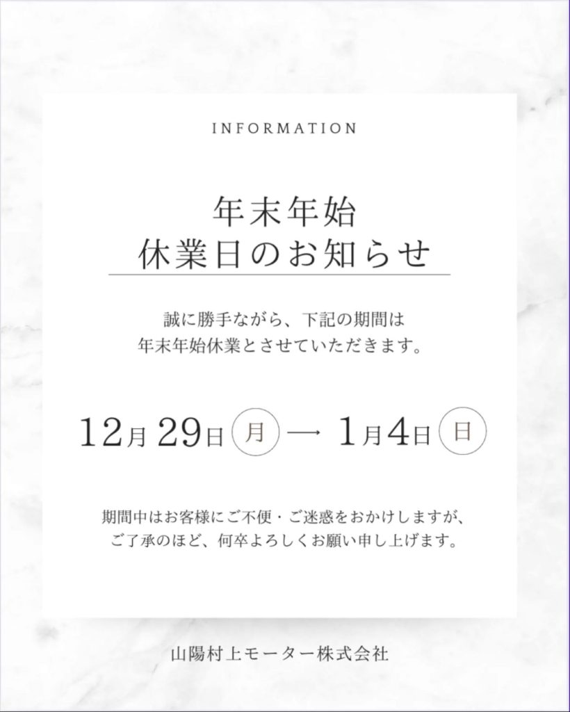 12/29(月)〜1/4(日)はショールーム、サービス工場共に