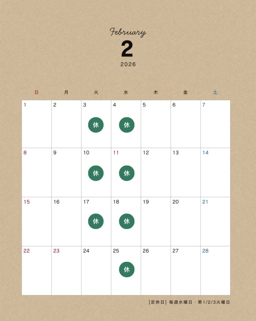 ※ 2月11日(水)は祝日ですが、定休日となります。 皆様には大変ご不便をおかけいたしますが何卒ご了承くださいますようお願い申し上げます🙇